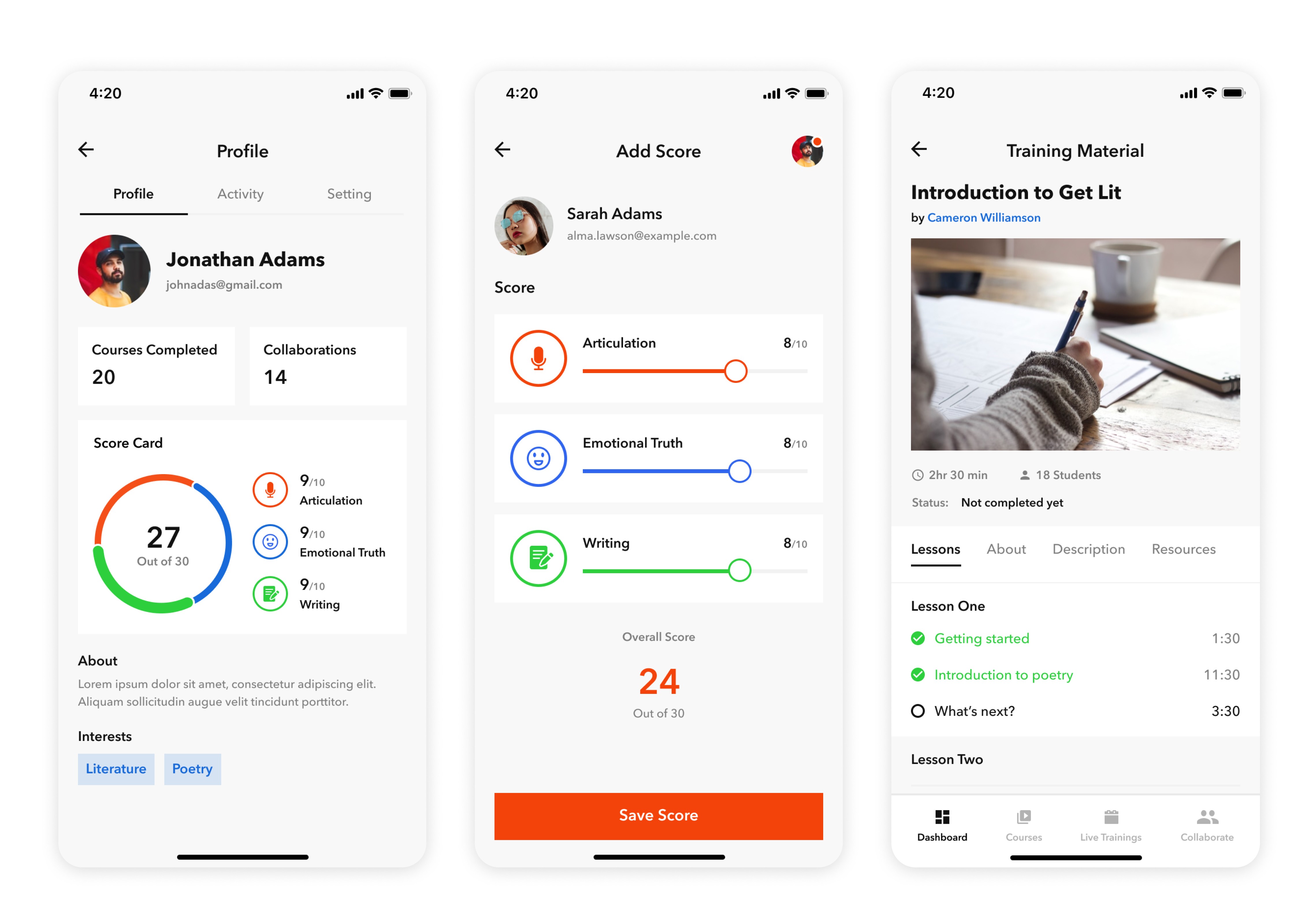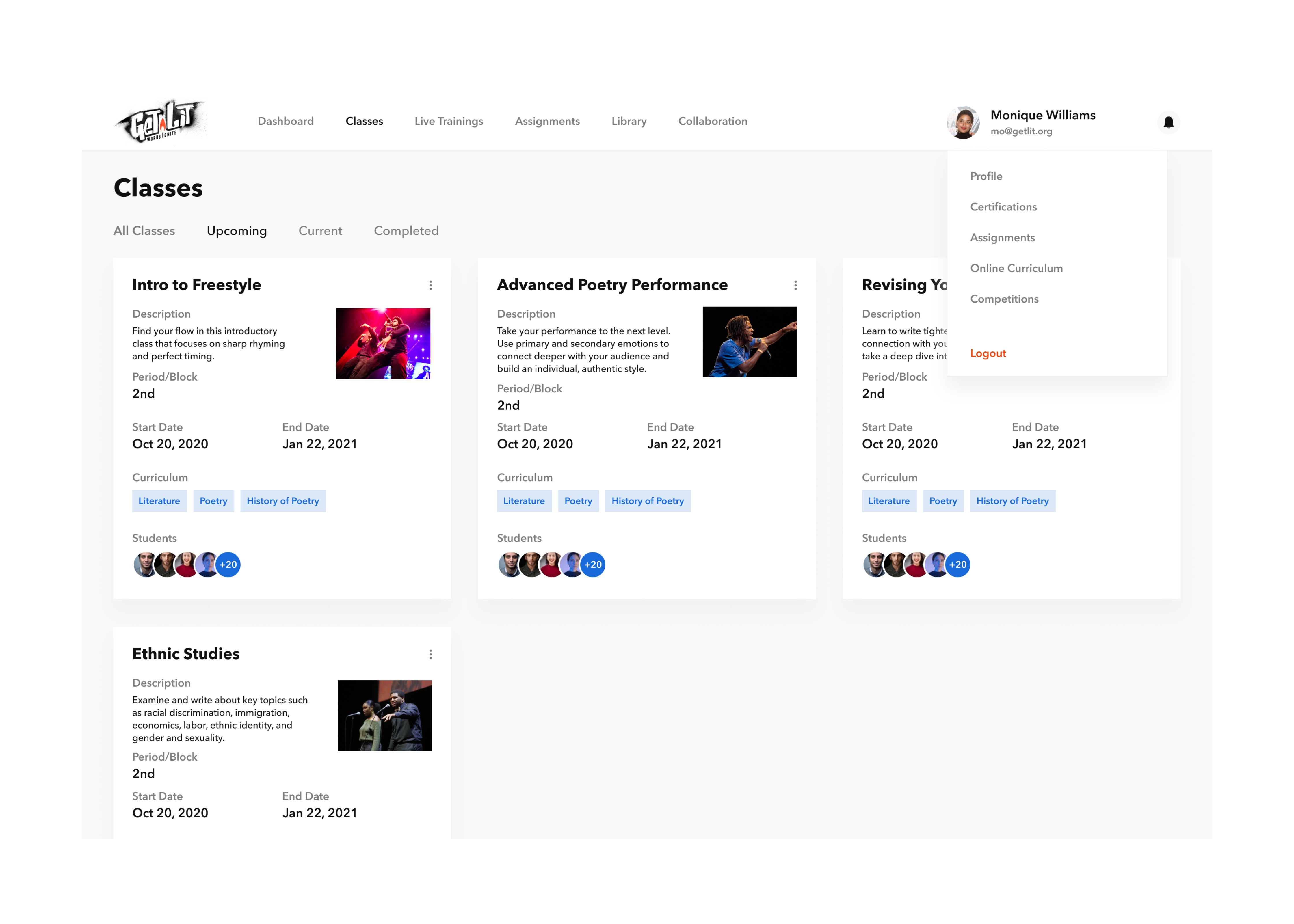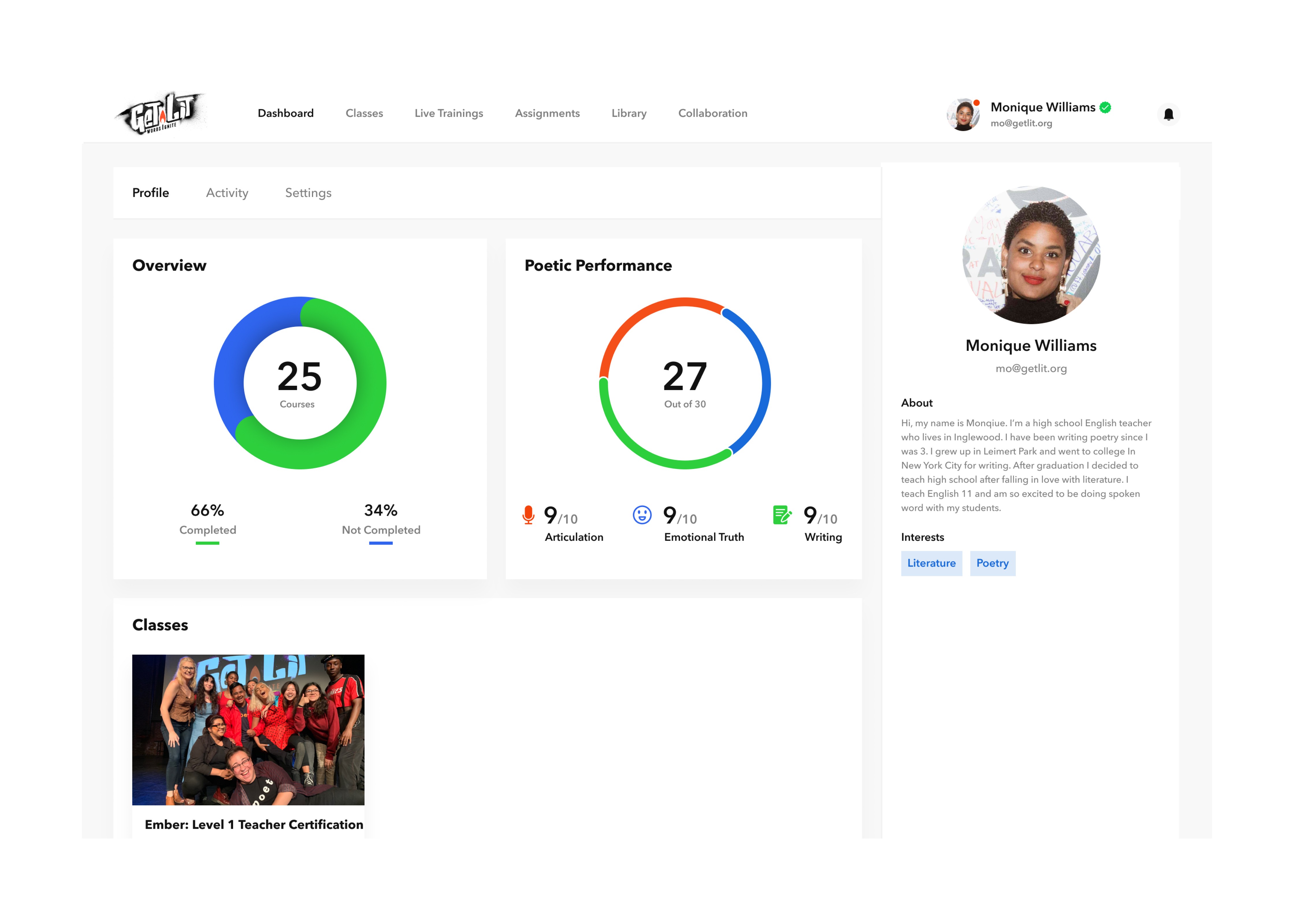 The interface prioritized clarity, structured navigation, and role based journeys so each user type could move through the platform efficiently. The overall goal was to make the system easy to use so users could focus on learning poetry rather than learning the software.